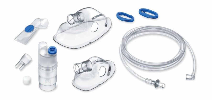 Phụ kiện đi kèm: mặt nạ người lớn, mặt nạ trẻ em, ống xông miệng, ống rửa mũi, ống xông mũi