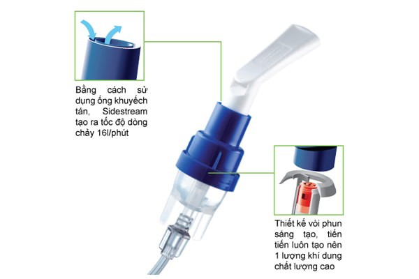 - SideStream được thiết kế để thu hút khi vào bên trong nhiều hơn, thông qua hoạt động của hệ thống khuếch tán, tạo kết quả trong công việc phân phối thuốc nhanh hơn và thời gian điều trị ngắn. Với vòi phun hình thoi duy nhất được thiết kế nhằm giúp giảm thiểu sự hao mòn trong quá trình sử dụng thường xuyên và hỗ trợ sự cung cấp lượng khí phù hợp với chất lượng cao.