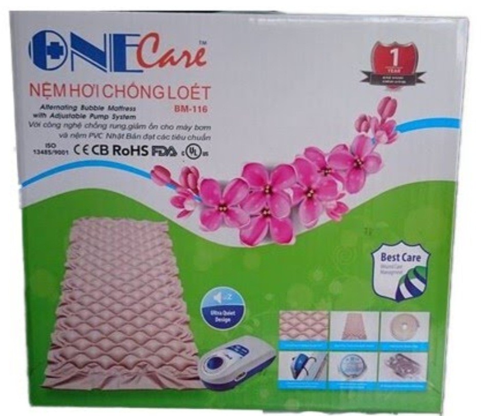 Nệm hơi chống loét OneCare BM-116 với công nghệ chống rung, giảm ồn cho máy bơm và nệm PVC Nhật Bản đạt các tiêu chuẩn quốc tế: ISO 13485/9001, CE, CB, RoHS, FDA, C(UL)US.